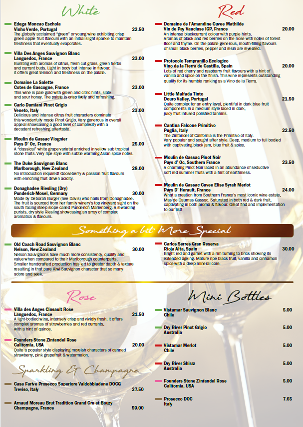| Villa Des Anges Sauvignon Blanc Languedoc, France | 20.00 | Domaine de l’Amandine Cuvee Mathilde Vin de Pay Vaucluse IGP, France | 20.00 |